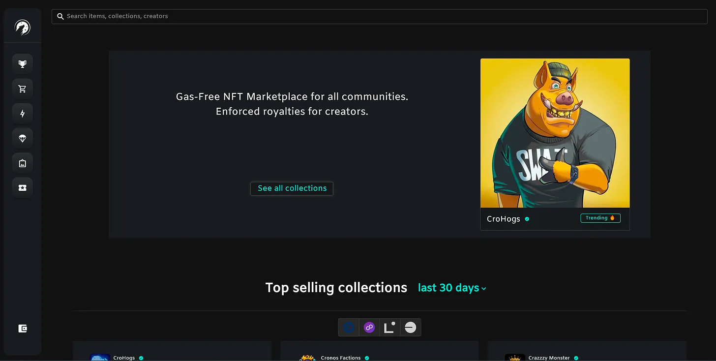 Moonflow는 #CROFam의 요구와 니즈로 인해 만들어진 탈중앙 가스비가 없는(gas-free) NFT 마켓플레이스입니다. Moonflow는 크로노스를 메인넷 위에서 1년 넘게 빌딩하고 있으며, 수백개의 크로느스 NFT 컬렉션을 리스팅 했습니다.
